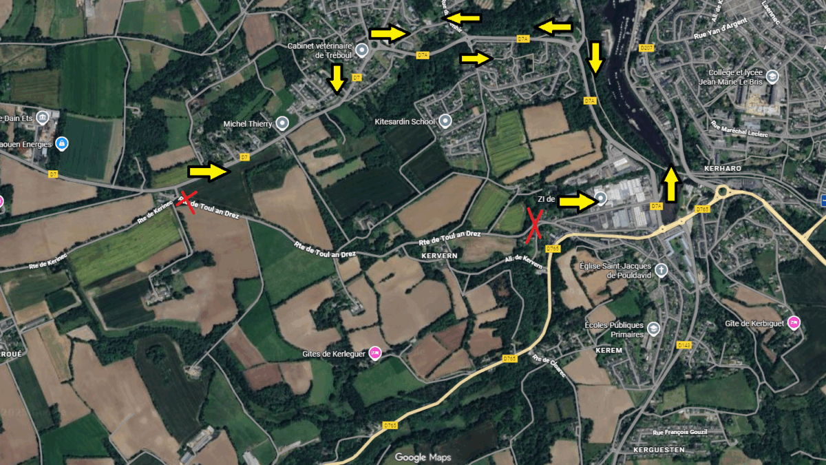 - Les véhicules seront déviés dans les deux sens par les voies suivantes : route de Poullan, rue du Commandant Fernand, boulevard Jean Moulin.